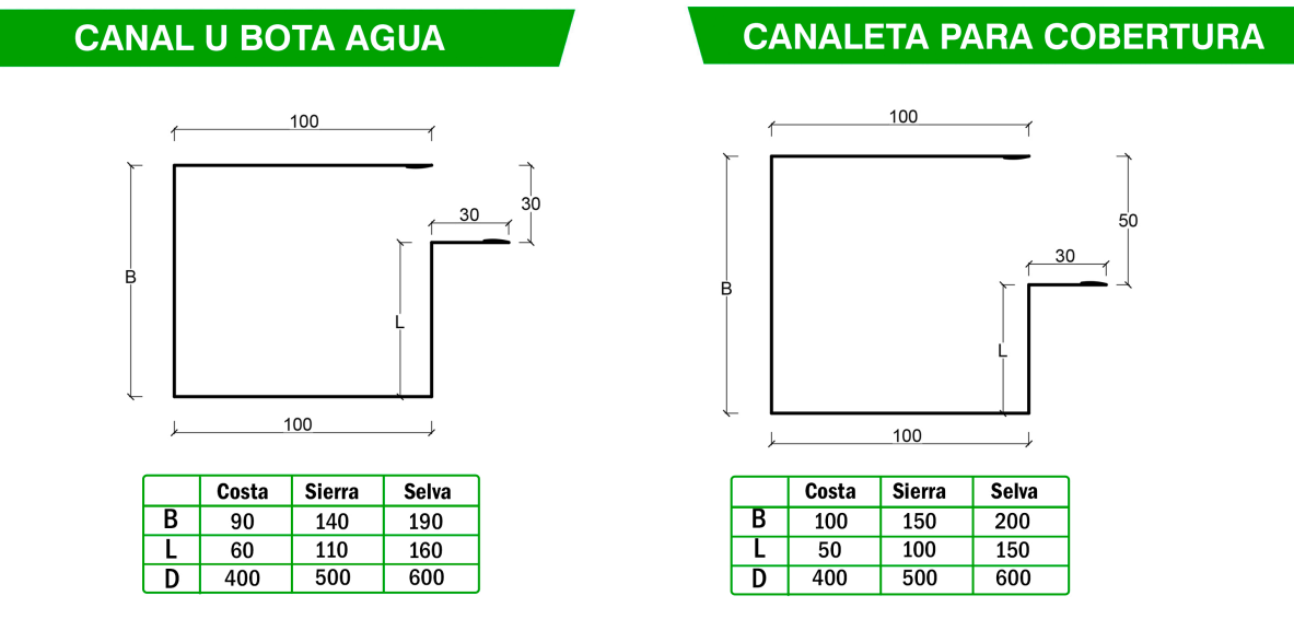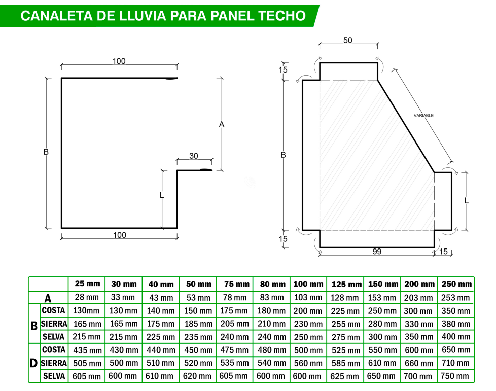 Es un accesorio metálico fabricado en Aluzinc que cumple la función de guiar y canalizar el flujo de agua en los sistemas de techos y muros con paneles termoacústicos. Su perfil en forma de "U" permite un encaje seguro con los bordes de los paneles, facilitando la evacuación eficiente del agua y evitando filtraciones que puedan afectar el aislamiento térmico.