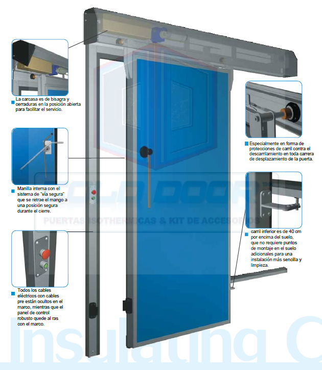 Aísla y optimiza tus espacios con puertas corredizas de panel termoacústico, con riel y guía para un cierre preciso.